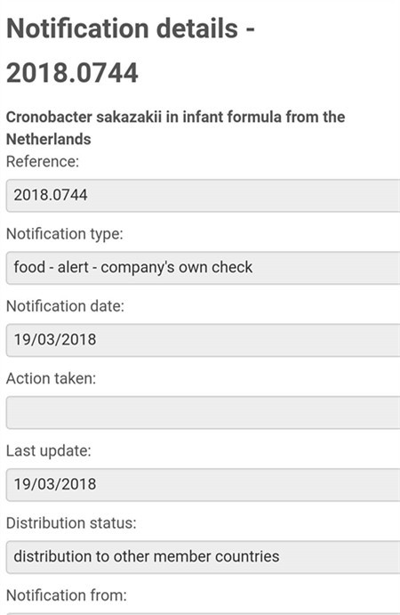 欧盟食品饲料类快速预警系统(RASFF)3月19日发布预警信息称,一批次由荷兰企业生产的婴幼儿配方奶粉遭到致病菌阪崎肠杆菌的污染,且被污染的奶粉已被销往中国、沙特阿拉伯、瑞士、英国和越南。