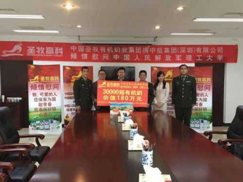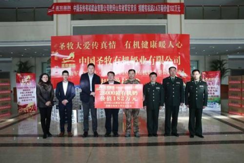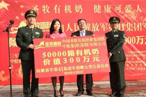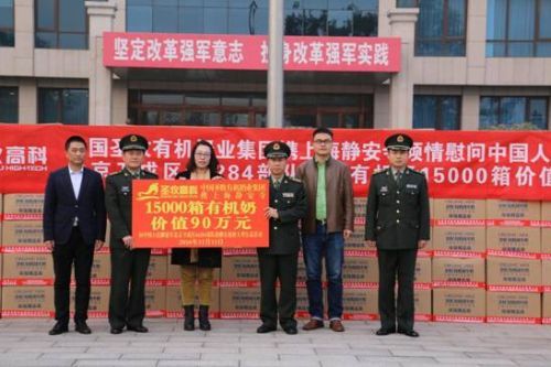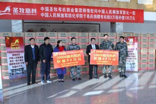 据悉,为响应双拥工作指示,中国圣牧有机奶业集团携手中组集团(深圳)有限公司、上海静安寺、广东东华禅寺和社会各界人士,从今年8月起开展大型慰问活动,行程十几万公里,已看望慰问陆、海、空、火箭军部队等单位达到209家,所赠乳品价值近一亿五千万元。和平年代,这样大规模的慰问活动尚属首次。