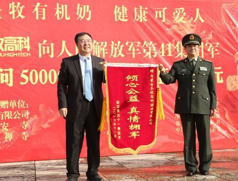 在此次慰问活动中,第41集团军副政委高大光向圣牧集团董事长姚同山敬赠了锦旗,同时他表示:“在全党全军深入贯彻学习党的十八届六中全会精神之际,圣牧集团携手中组集团到集团军慰问,表达了对部队官兵的关切,体现了浓浓的拥军情谊,让他们深受鼓舞,他们将把这份真情真意转化为强大的精神动力,加强训练,提升战斗力,为国家安全、社会稳定保驾护航!”