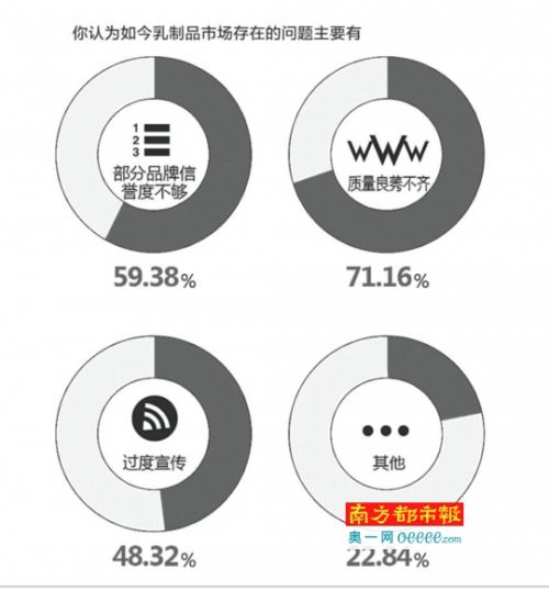 对于乳制品市场存在的主要问题,在问卷调查选项中,排第一的“质量良莠不齐”,投票率高达71.16%,其次是“部分品牌信誉度不够”(59.38%)。对于企业的过度宣传,消费者也比较反感,投票率为48.32%.