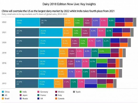 近日,Euromonitor的一份数据引发了乳品行业的高度关注。报告显示,5年后,由于乳制品消费需求的变化,中国将超越美国成为全球最大乳制品消费市场。2016年,美国占全球乳制品市场份额的21.8%,而中国为18%;预计到2022年,中国乳制品销售总额将占全球的20.4%,而美国为20.1%。