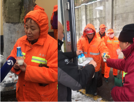 在民进南京市委、江宁区委统战部、江宁区工商联的号召下,今天一早,卫岗乳业携手现代快报、南京零距离等媒体,为了能让忙碌的环卫工人在冰冷的暴雪天气吃上热乎乎的早餐,特地安排工作人员为辛勤的环卫工人们送上新鲜的牛奶和早餐,让这些辛勤的环卫工人切身感受冬日温情。一杯奶,温暖一座城市,因为有爱,大雪不冷。