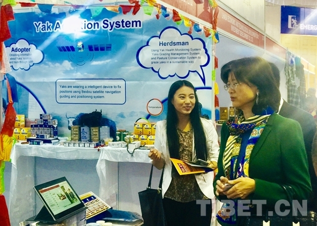 图为中国驻尼泊尔大使馆大使于红(右一)参观西藏高原之宝展区,了解牦牛物联网创新发展模式