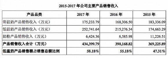招股书披露的最近三年业绩显示,2015-2017年,新希望乳业营业收入为39.15亿元、40.53亿元和44.22亿元,同期净利润为2.97亿元、1.46亿元和2.16亿元。从营业收入、各类产品占比、毛利率贡献占比等类目看,低温产品的营收为新希望乳业贡献了一半以上的业绩,该品类产品的毛利率也远高于常温产品。