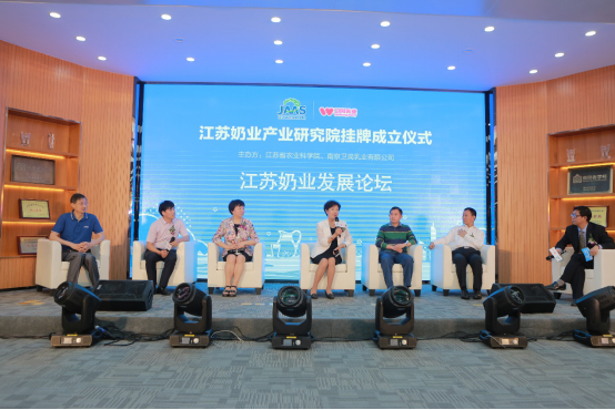 揭牌仪式之后,现场举行了江苏奶业产业论坛,中国乳制品工业协会副会长兼秘书长刘美菊女士,中国奶业协会副秘书长周振峰先生,动物营养学国家重点实验室主任、中国农科院王加启研究员,江苏省奶协会长、南京农大王根林教授,国家奶牛产业技术体系岗位科学家、中国农大施正香教授,国家奶牛产业技术体系岗位科学家、山东省农科院杨宏军研究员等悉数到场,就“近年来我国乳制品行业取得的进步并展望一下未来的发展前景”、“未来江苏省奶业发展的方向”等提问分享了他们经验与见解。