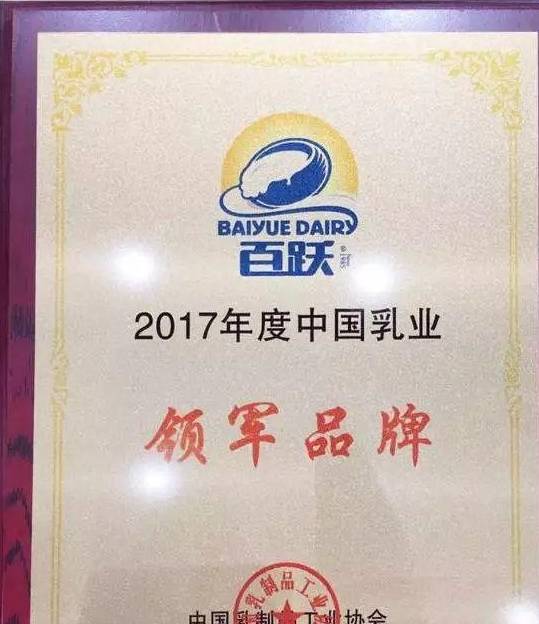 2017年12月,为进一步树立中国乳业品牌形象,发挥行业主流品牌引领作用,提升行业信誉和公信力,打造具有全球影响力的中国乳企品牌,在工信部和国家食品药品监督管理总局的指导下,中国乳制品工业协会在京召开了“中国乳业国家品牌建设论坛”,论坛上发布了“中国乳业领军品牌榜”,国内仅12家乳品企业荣此殊荣,西安百跃羊乳集团有限公司“百跃品牌”就是其中之一。