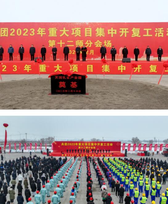 为加快重点项目建设,实现首季“开门红”, 2月16日下午,兵团举办2023年重大项目集中开复工仪式,第十二师分会场设在天润乳业年产20万吨乳制品加工项目现场。兵团党委常委、副政委,兵团党委组织部部长张文胜,兵团交通运输局党组书记秦伟,十二师党委书记、政委李斌,师党委副书记、师长侯国俊等兵师领导出席十二师开复工仪式。五一农场、三坪农场、天润乳业、国资公司等单位领导及职工代表近500人参加启动仪式。