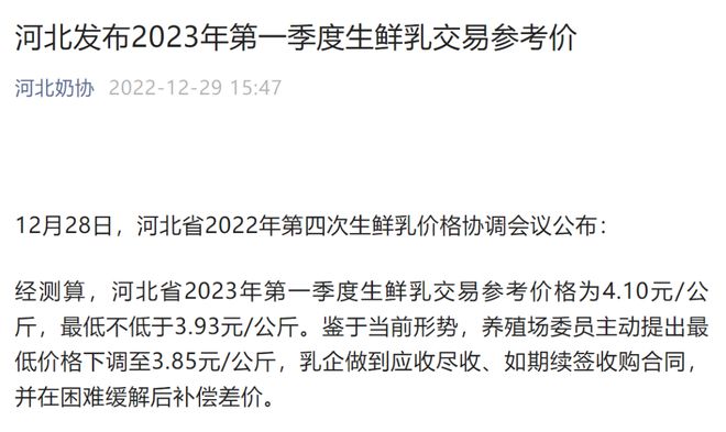而另一方面,生牛乳市场却越来越低迷。2022年12月28日,河北省奶业协会公布,河北省2023年第一季度生鲜乳交易参考价格为4.1元/公斤,最低不低于3.93元/公斤,乍看起来并不低。因为疫情之前,2019年河北省第四季度生鲜乳交易参考价格为3.85元/公斤,最低不得低于3.62元/公斤, 2020年第二季度跌到3.6元/公斤,最低限价3.4元/公斤;直到2021年上半年,交易参考价才上涨到每公斤4元至4.17元之间,最低限价也在3.9元上下徘徊。