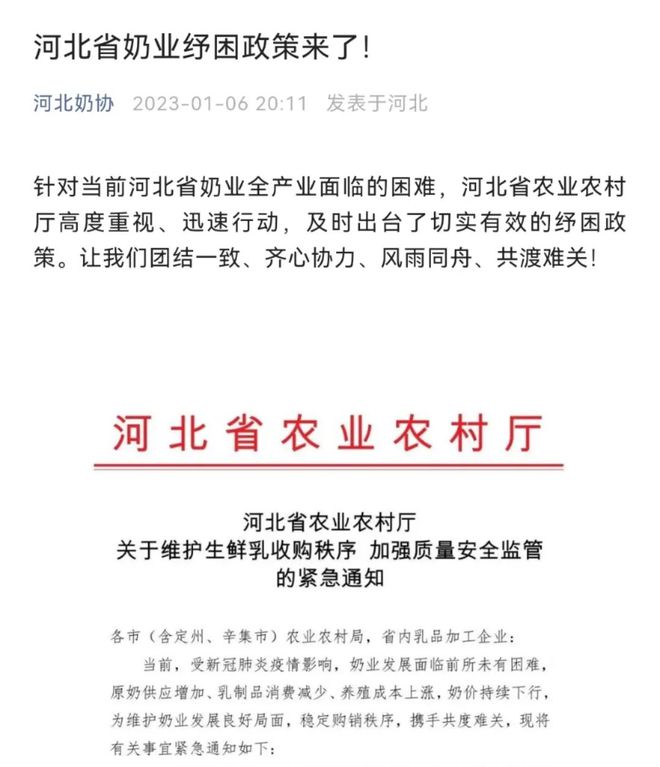 面对低迷的奶业市场,2023年1月6日,河北省农业农村厅发布通知,将在1月20日前补贴乳品加工企业,帮助缓解资金压力。郑瑞能感受到,在政府补助下, “现在乳企确实是‘应收尽收’了”。不过他又补充道,“但还是架不住奶价低啊”。