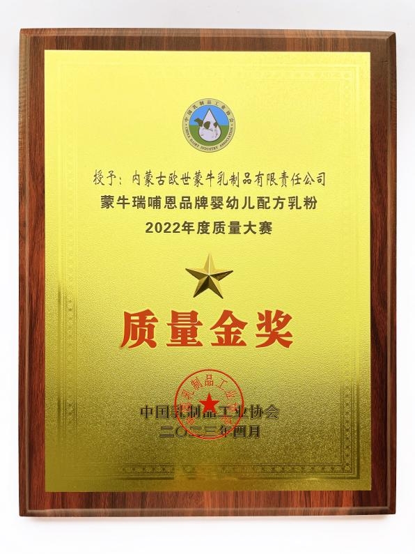 (图:蒙牛瑞哺恩荣获2022年度质量大赛“质量金奖”)