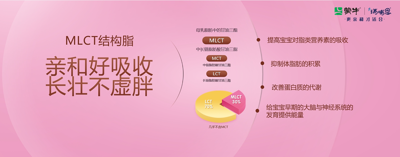 研究团队发现,母乳中的中链脂肪酸几乎都是以中长链甘油三酯(MLCT)的形式存在,MLCT的天然存在有利于中链脂肪酸的平稳释放,对于胃肠道尚未发育成熟、能量需求高的婴幼儿来说至关重要,更利于婴幼儿消化吸收,不易造成代谢负担和脂肪积累,亲和好吸收,长壮不虚胖。