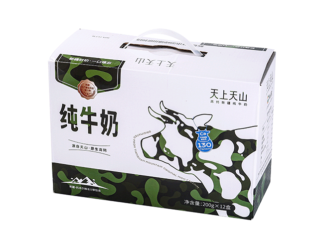 “天上天山”迷彩风纯牛奶,规格为200mL/盒,有礼盒装(12盒/提)、家庭装(24盒/提)可选。