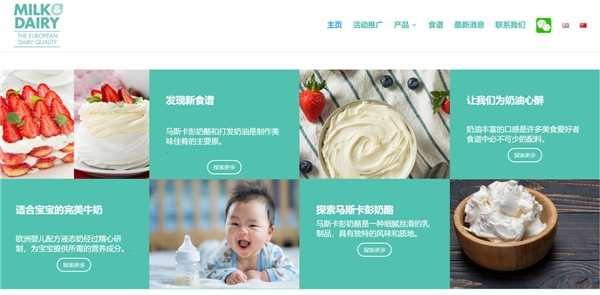 2023年8月微信公众号开启。在此期间,共发布了28篇文章,获得了20,330名关注者,访问量超过了100,000次;官方网站http://www.milkdairy.eu/从11月底对外开放,为了方便大家浏览和访问,该网站提供了英文和中文两个版本;尊重中国市场并理解KOL的影响,EDIS在此期间与3位知名KOL合作:Xinhe、Super Luka和Su Su_Hachi,共同拍摄了3个视频食谱和1个故事视频,以更好地让公众了解该项目内各种产品的特点和用途。