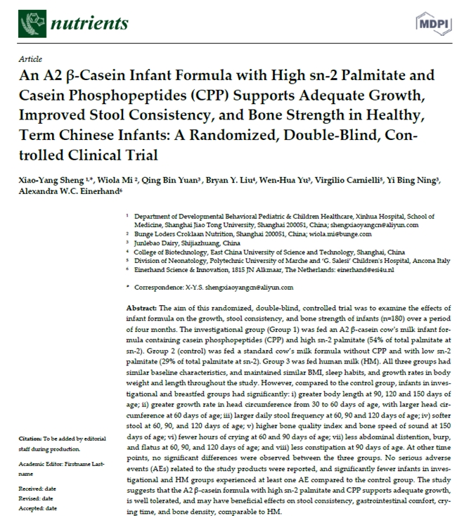 同时,进一步的生物样本分析证实,至臻A2婴儿配方奶粉中富含的高Sn-2棕榈酸酯OPO(Betapol)和酪蛋白磷酸肽(CPP),能够增加钙和脂肪酸等营养物质的吸收,并有助于肠道微生物菌群的平衡,增强有益肠道菌双歧杆菌和乳酸菌的丰度。