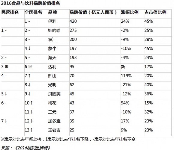 其他进入该榜单的食品饮料品牌包括娃哈哈、双汇、蒙牛、海天、达利、辉山、光明、贝因美、梅花、三元、加多宝、王老吉。而去年上榜的农夫山泉、露露、雨润和老干妈却没有出现在今年的榜单中。