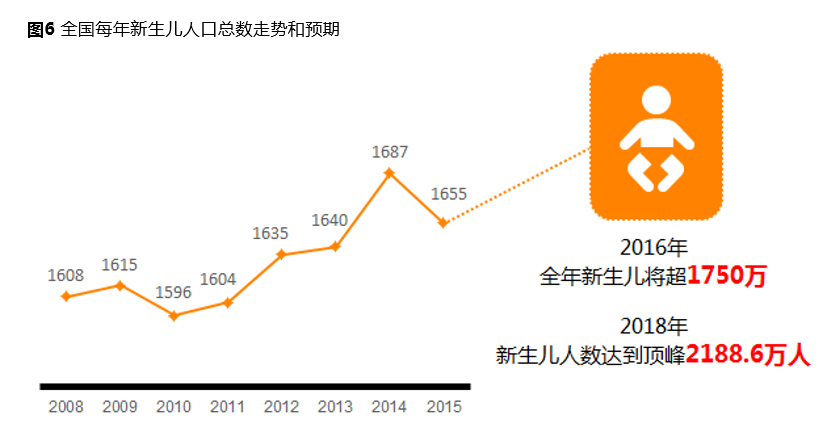 根据尼尔森最新公布的2016中国婴幼儿行业蓝皮书显示,在“双独二孩”和“单独二孩”出台后,国内新生儿数量保持稳定而缓慢的提升。全国预期将在2016年迎来超过1750万的新生儿,在2018年新生儿人数预期达到新的顶峰2188.6万人。菲仕兰全球总裁鲁乐夫在接受第一财经记者专访时也认为,二孩政策的利好会在2018年显现,届时中国的配方奶粉市场会迎来快速增长。