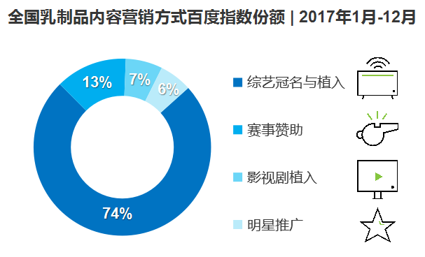 如今营销方式复杂多样且优势各异,选择合适的媒介对于提升营销投资回报率至关重要。报告发现,全国乳制品营销方式主要为综艺冠名与植入、赛事赞助、影视剧植入与明星推广, 分别占比74%、 13%、7%与6%。而乳制品行业营销活动带来的百度指数搜索量排名前6的厂商已经占据行业总体搜索量的82%。