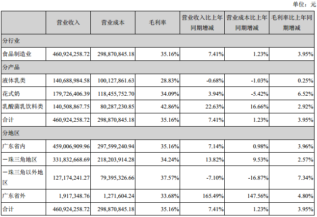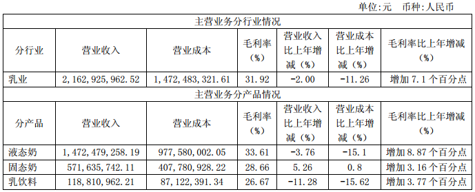 光明乳业主营业务分行业、分产品情况: