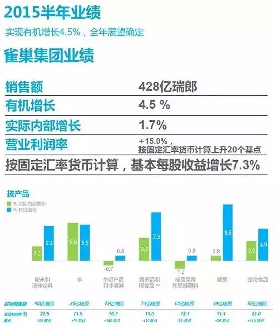 雀巢半年报中显示,其2015年上半年销售额达428亿瑞郎,实现有机增长4.5%。但其按产品品类核算,其牛奶产品和冰淇淋实现销售额72亿瑞郎,达营业利润16.7%,实际内部增长为负数,即-0.7%。