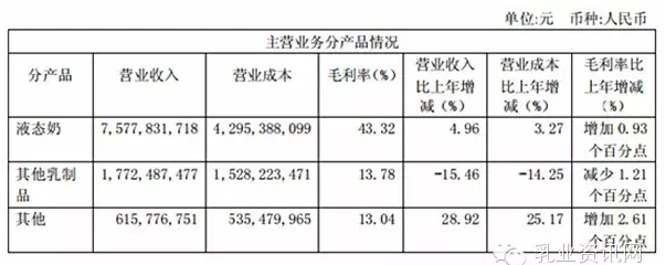 伊利主营业务分行业、分产品情况: