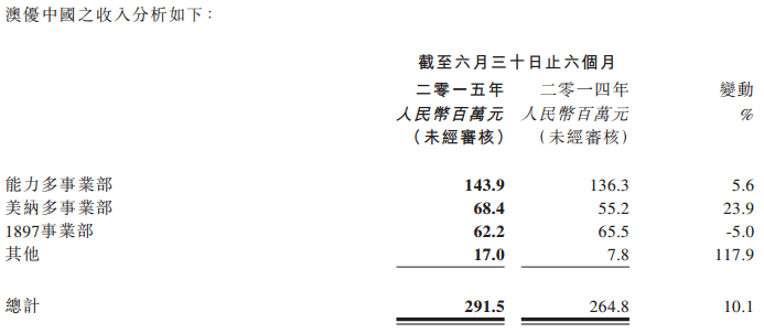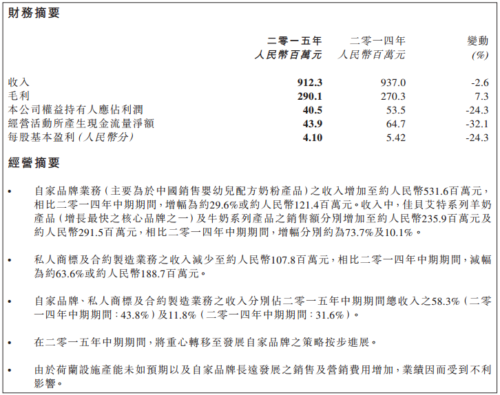 澳优乳业2015年上半年收入9.12亿元,上年同期9.37亿元,本报告期比上年同期减少2.6%。其中毛利约为2.90亿元,同比增长约7.3%,毛利率则约为31.8%,同比增长约3%。自家品牌业务销售收入为5.31亿元,同比增长29.6%。羊奶粉佳贝艾特(“Kabrita”)在中国的销售额比2014年同期增长了71.9%,已成为公司增长最快的品牌之一。
