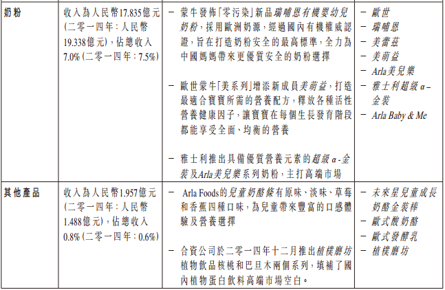 对于收入中1.1%的下降比例,蒙牛公司在报表的“财务回顾”中直接指出,特仑苏、优益C、纯甄等品牌增长强劲,促进了产品结构的提升;雅士利期内收入人民币11.615元,较2014年15.457元有所降低。若不含雅士利,集团收入从2014年242.901亿元到2015年244.029亿元将有0.5%的增幅。