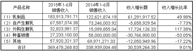 现代牧业在财务报表中表示:集团截至2015年6月30日止6个月收入24.4亿元,其中液态奶产品业务销售额达人民币78949万元,同比增长177.4%,原奶销售人民币1 647.8万元,占集团总收入的67.6%。现代牧业在财务报表中给出了部分收入明细分析: