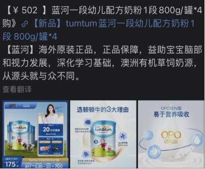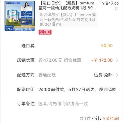 值得注意的是,在某平台上有不少购物营销号发布了蓝河旗下奶粉营销活动相关内容,并附上了活动链接,打开上述链接后可以发现,最终的价格与原始标价相比竟然优惠了472元,最终以374.95元的价格就能买到4罐800g装的蓝河一段顿顿牛奶粉。
