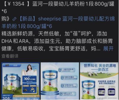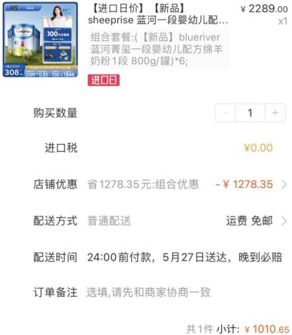 同样,蓝河菁玺一段婴幼儿配方绵羊奶粉的活动折扣也不小,6罐800g装的最终价格为1010.65元,以此计算每罐约为168.4元。