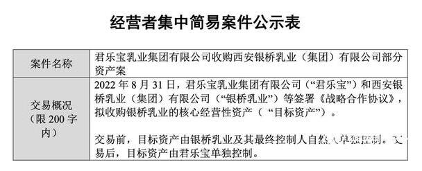 日前,国家市场监督管理总局网站,对君乐宝收购西安银桥乳业(集团)有限公司(下称银桥乳业)部分资产案进行公示,根据该公示显示,君乐宝将并购银桥乳业的高温灭菌奶、巴氏杀菌奶及婴幼儿配方奶粉等核心经营性资产,交易完成后,银桥乳业将由君乐宝方面单独控制。公示期截至11月13日。