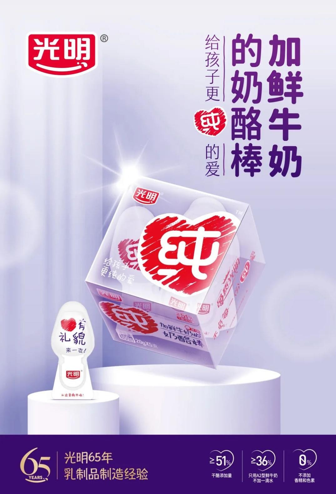 比如光明乳业打造的光明纯奶酪棒,不加一滴水,用≥36%A2β-酪蛋白鲜牛奶替代水,高钙低盐,维生素D促进钙吸收,无香精、无色素,最大程度地保留食材原有的味道,纯净自然,奶味香醇,营养健康,让孩子放心食用。