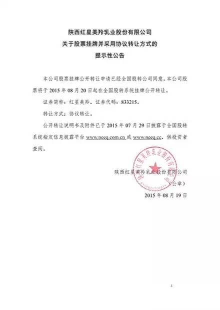 2015年8月20日,陕西红星美羚乳业股份有限公司正式在全国中小企业股份转让系统(“新三板”)挂牌上市,证券简称:红星美羚,股票代码:833215。