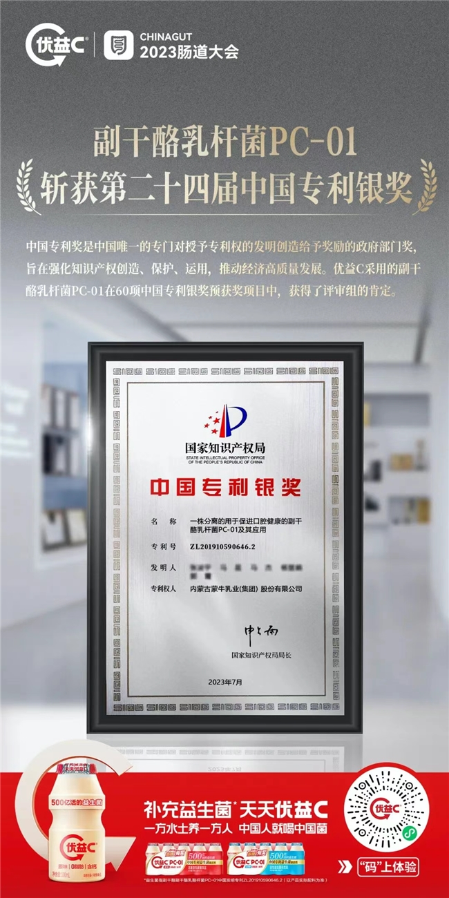 前期研究显示,消化不良的成人人群服用中国专利益生菌PC-01饮品28天后的症状改善率高达88%。如今中国专利益生菌PC-01已被优益C应用到全线产品中,并实现了活菌数500亿cfu/100ml的突破,取得了显著的经济效益和社会效益。优益C凭借自主知识产权实现了“中国益生菌突破”,中国专利益生菌PC-01在2023年获得中国专利银奖,这是目前乳业在专利领域的最高荣誉。