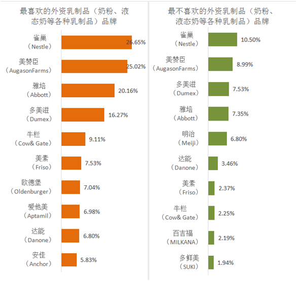 雀巢和美赞臣在受访者最喜欢和最不喜欢的乳制品榜单中均排在前两位,成为争议最大的两个乳制品品牌。