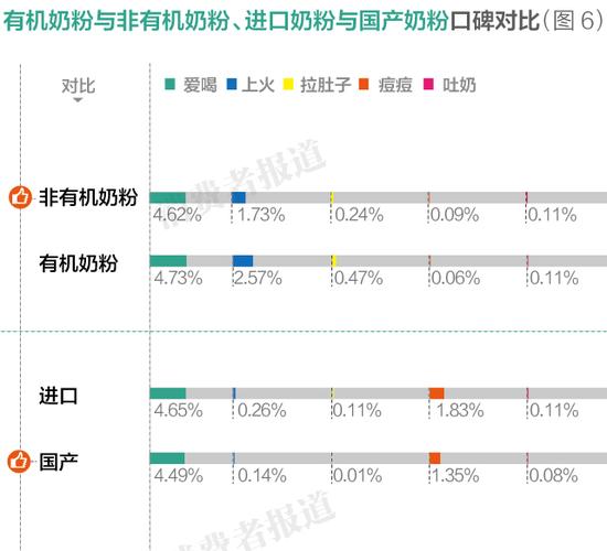 进口奶粉一定好?有机奶粉更安全?虽然无法直接地进行营养、安全性指标的PK,但单单从一线宝妈对于宝宝“不良反应”的反馈而言,国产奶粉整体并不逊色于进口奶粉,有机奶粉并没有想象中的好评如潮。(如图6)
