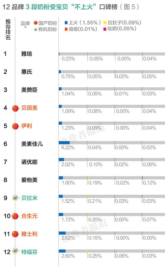 2016年5月,《消费者报道》试图通过对比诺优能、惠氏、美素佳儿、爱他美、雅培、伊利、美赞臣、贝因美(13.320, 0.06, 0.45%)、合生元和雅士利十品牌婴幼儿奶粉,贝拉米和特福芬两品牌有机婴幼儿奶粉100万条商品评价数据,告诉你哪款奶粉被奶妈吐槽最多,哪款奶粉更受宝宝喜爱。