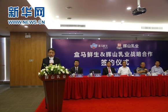 新华网南京7月23日电(徐健 陈鹏飞/文 郭晴/摄)7月23日下午,日产500吨高品质乳制品的江苏辉山公司牵手上海翌恒网络科技有限公司(盒马)在沈阳签署深度战略合作协议。双方将实现供应链管理的跨界整合,共同推出中国首个乳业O2O品牌——"哞客",并率先进军华东市场。辽宁沈阳市副市长沙波涛、江苏射阳县县长唐敬、中国奶协乳制品工业委员会副主任顾佳升、辉山集团董事局主席杨凯、盒马鲜生创始人侯毅等领导和嘉宾出席签约仪式并致辞。