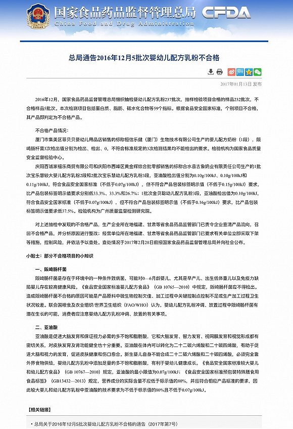 上周五,国家食药监总局在官网公布了2016年12月5批次婴幼儿配方乳粉不合格的通告,通告全文如下:
