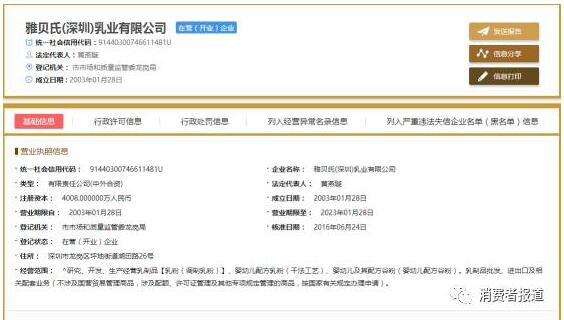 全国企业信用信息公示系统显示,雅贝氏成立于2003年1月28日,注册资本为4008万元人民币,属于中外合资企业,法定代表人为黄燕璇。
