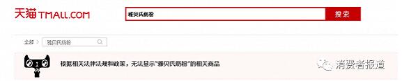 1月19日,消道长在天猫、京东等平台搜索雅贝氏奶粉,天猫的搜索结果显示:根据相关法律法规和政策,无法显示“雅贝氏奶粉”的相关商品。