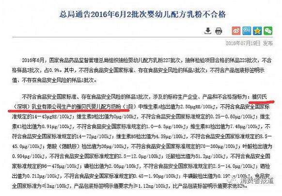 2016年7月19日,国家食药监总局发布一批婴幼儿配方乳粉不合格的通告,通告显示,由雅贝氏(深圳)乳业有限公司生产的一款雅贝氏婴儿配方奶粉1段抽检不合格。