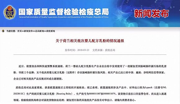 刚刚,国家质量监督检验检疫总局在官网发布了一则《关于荷兰相关批次婴儿配方乳粉的情况通报》的文件。