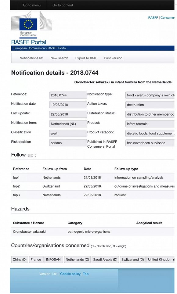 今天,小食代仔细翻查了本次欧盟通报。根据RASFF(欧盟食品饲料类快速预警系统)的页面,该事件被描述为“来自荷兰的婴幼儿配方奶粉里的阪崎肠杆菌”,通报描述是“公司自检发现”,通知日期是2018年3月19日,所采取的行动是“销毁”。RASFF形容,风险情况属于“严重”,不过还未向消费者通报事件。