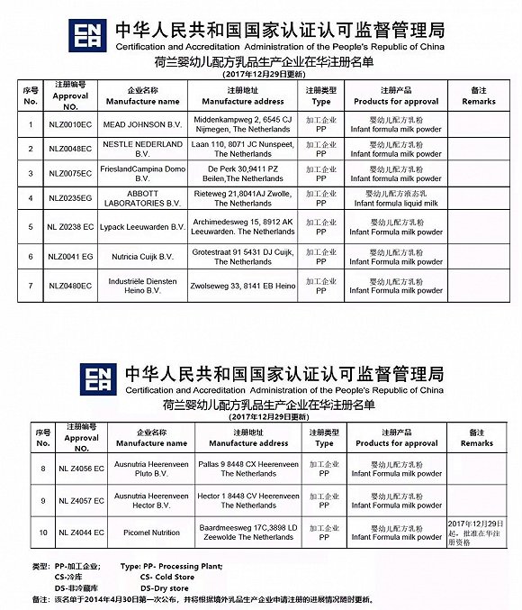 翻查中国认监委的名单,目前有10家生产企业获得了在华注册资格,如下图所示。