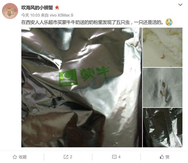 8月15日,网友“吹海风的小螃蟹”在微博爆料称,自己在西安人人乐超市凤城二路店购买牛奶赠送的奶粉里发现活虫,目前西安市未央区食药监局已经介入调查。