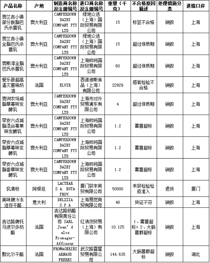 除此之外,来自阿根廷的50吨乳清粉因未获检验检疫准入遭退货;产于意大利的美味牌冷冻迷你干酪因货证不符未通过检验;法国的爱乐薇超高温灭菌稀奶油因感官检验不合格被销毁。