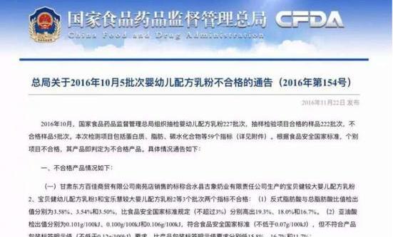 国家食药监局昨天发布了今年10月抽检不合格的5批次婴幼儿奶粉,此次检测项目包括蛋白质、脂肪、碳水化合物等59个指标。根据 食品 安全国家标准,个别项目不合格,产品即判定为不合格。 不合适的产品有:标称合水县古象奶业有限责任公司生产的宝贝健较大婴儿...