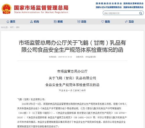 中国质量新闻网讯 从国家市场监督管理总局获悉,原国家食品药品监督管理总局组织对飞鹤(甘南)乳品有限公司进行了食品安全生产规范体系检查,发现企业在食品安全管理制度落实方面存在缺陷情况。 2018年3月6日8日,原国家食品药品监督管理总局组织食品安全生...