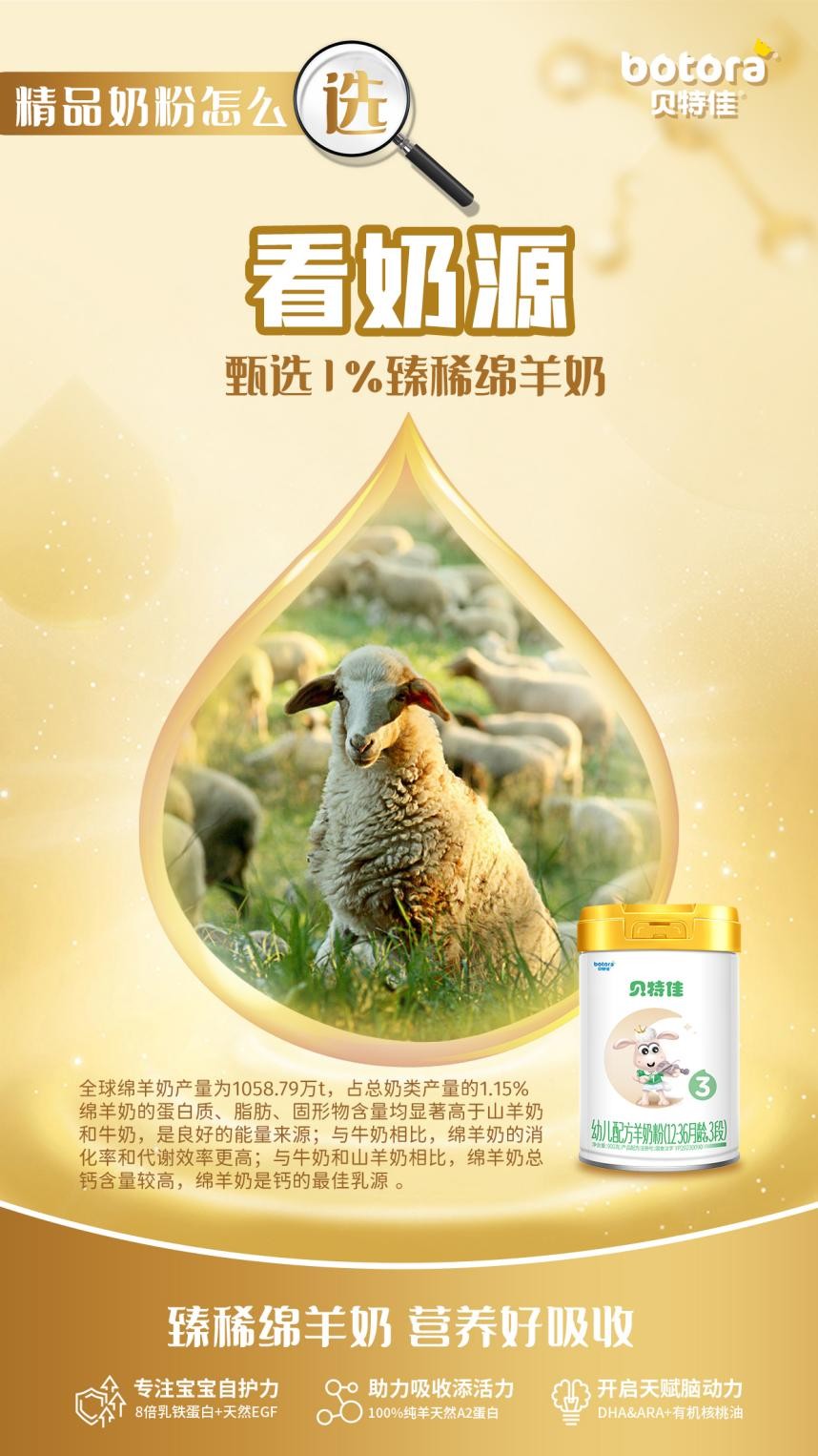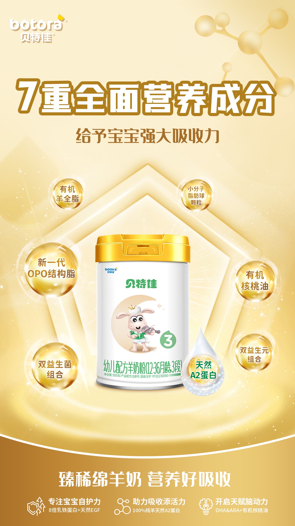 而且绵羊奶脂肪球颗粒比山羊奶更小,并富含天然OPO结构脂,可以为宝宝提供更加细腻温和的营养守护,是天然的营养佳品。作为羊奶粉赛道沉淀已久的优秀品牌,贝特佳前瞻性洞察绵羊奶粉细分赛道发展潜力,把握自身先发优势,于羊奶粉细分领域之上再细分,全新推出贝特佳婴幼儿配方绵羊奶粉,扩充品牌大单品矩阵的同时,为育儿家庭带去高端绵羊营养新选择。