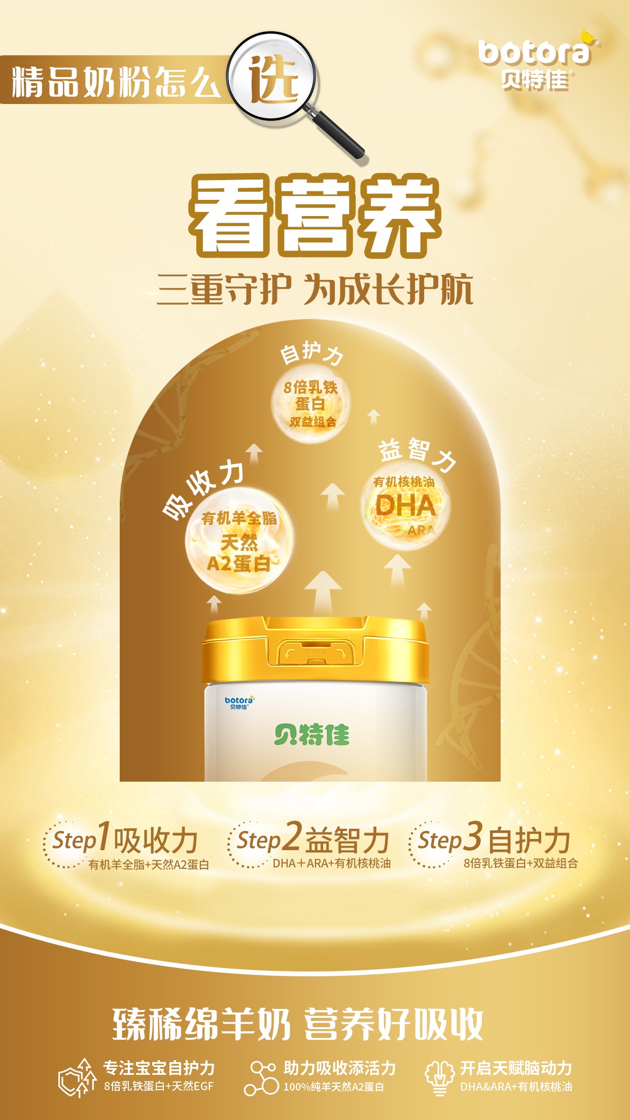 贝特佳此次全新推出高端绵羊奶粉,不仅通过了新国标奶粉注册,在配方营养搭配方面,更是精准锚定宝宝成长需求与肠胃发育特点,创新开发“纯羊+有机”组合优势,采用纯羊乳蛋白配方,并添加有机羊全脂做奶基,高效发挥绵羊奶温和易吸收与营养丰富的原生优势,与此同时,配方中添加有机核桃油成分,搭配DHA、ARA、叶黄素等,组成眼脑发育营养群,促进宝宝脑部更好发育。并有新一代OPO结构脂、双重益生菌、双重益生元同步添加,助力构建更健康的肠道生态,提升肠道抵抗力,让宝宝轻松远离肠胃不适烦恼,肚肚更安稳。